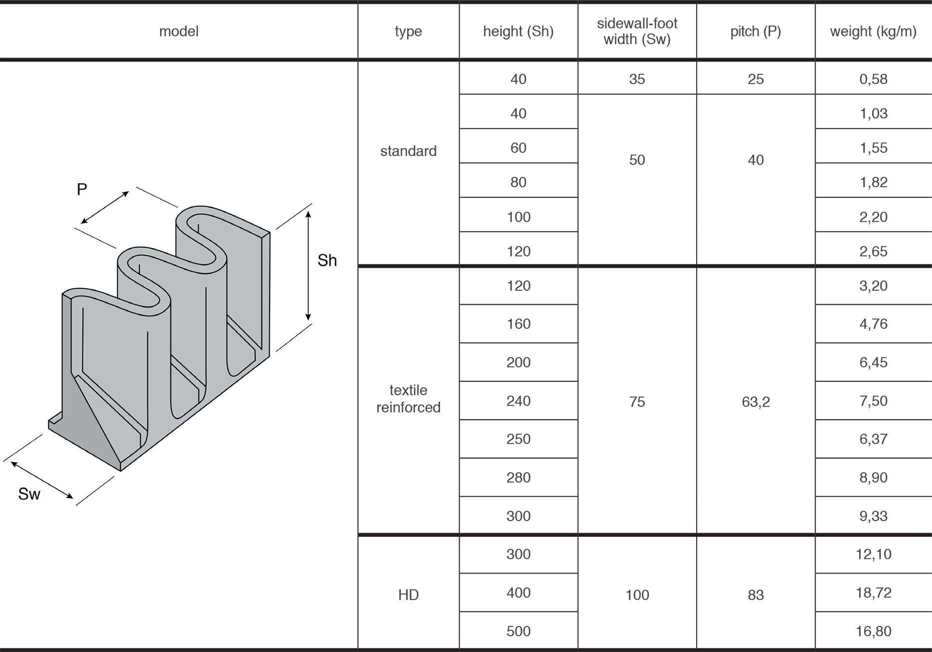 To increase the conveying volume of the belt, sidewalls are often vulcanised to each side of the conveyor belt. These sidewalls are exposed to high forces – in the transverse direction the sidewalls have to carry the weight of the conveyed material, while in the longitudinal direction the sidewalls are stretched and compressed, in particular at the deflection area. Because of this Ambelt® sidewalls are characterized by a wear-resistant and highly flexible rubber quality. Depending on the application, conveying capacity and customer requirements, Ambelt® offers different heights of sidewalls (40 mm to 500 mm in height) as well as fabric reinforced sidewalls. Ambelt® recommends a fabric insert for any sidewalls higher than 140mm. If the sidewalls need to be screwed to the cleats, a fabric insert becomes necessary.