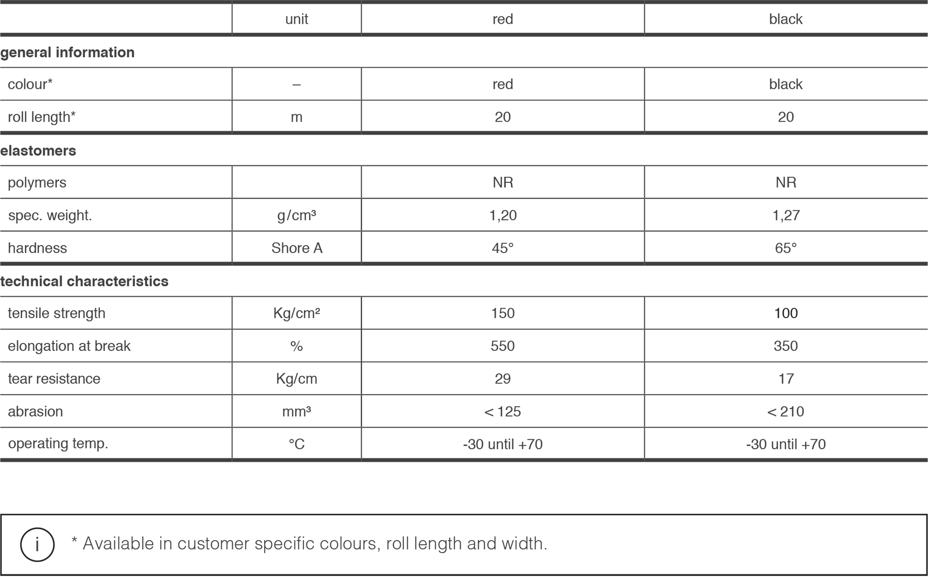 Skirting rubber is used for tranquilizing the material and for sealing the feeding point. The skirting rubber avoids the drop-down of material in the system periphery. Ambelt® skirting rubber is offered in rolls in various colours and qualities and is available in the thickness 5 mm to 30 mm and in the height 60 mm to 200 mm. Ambelt® Extra is our premium quality for extreme operating conditions.